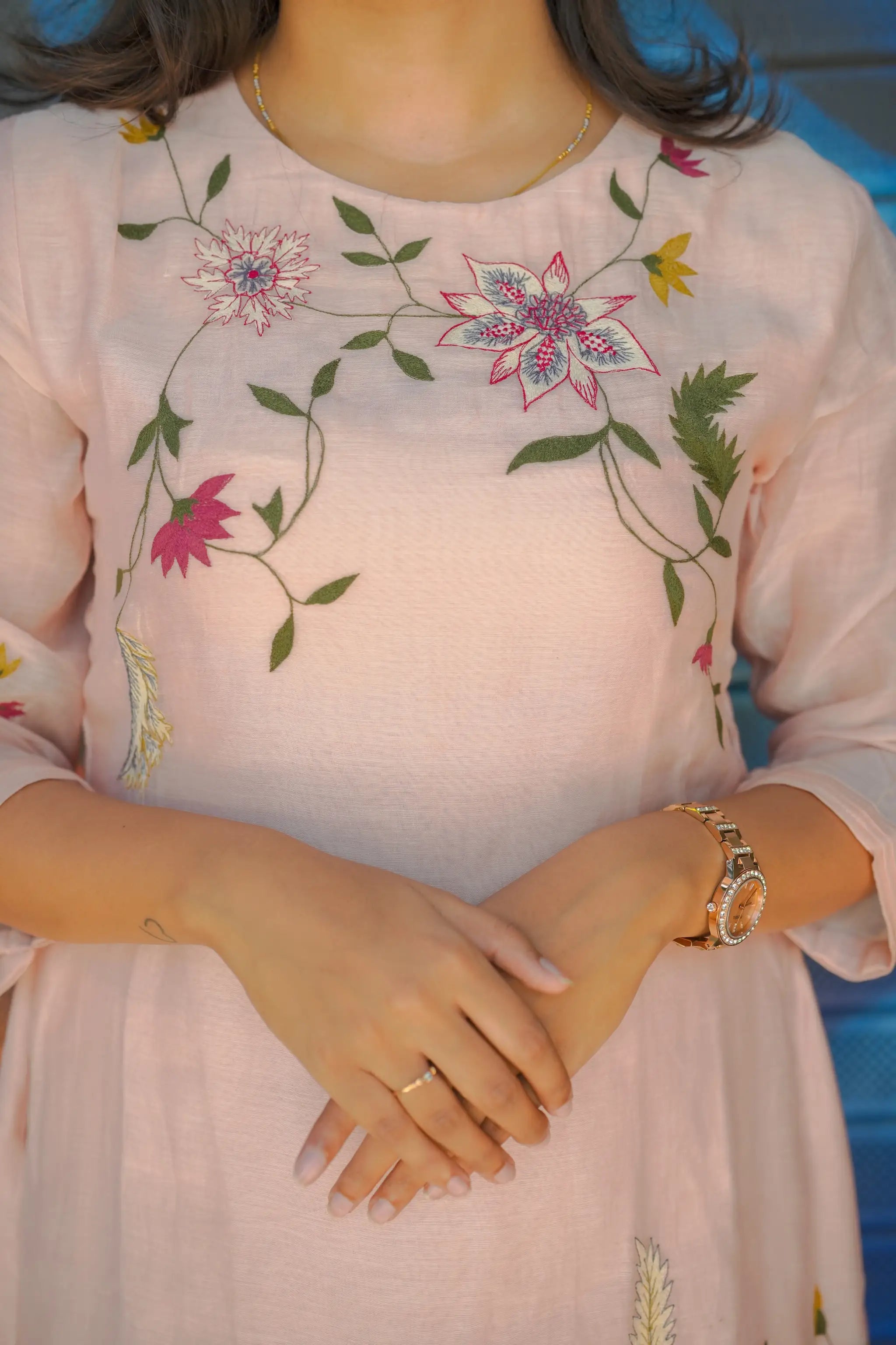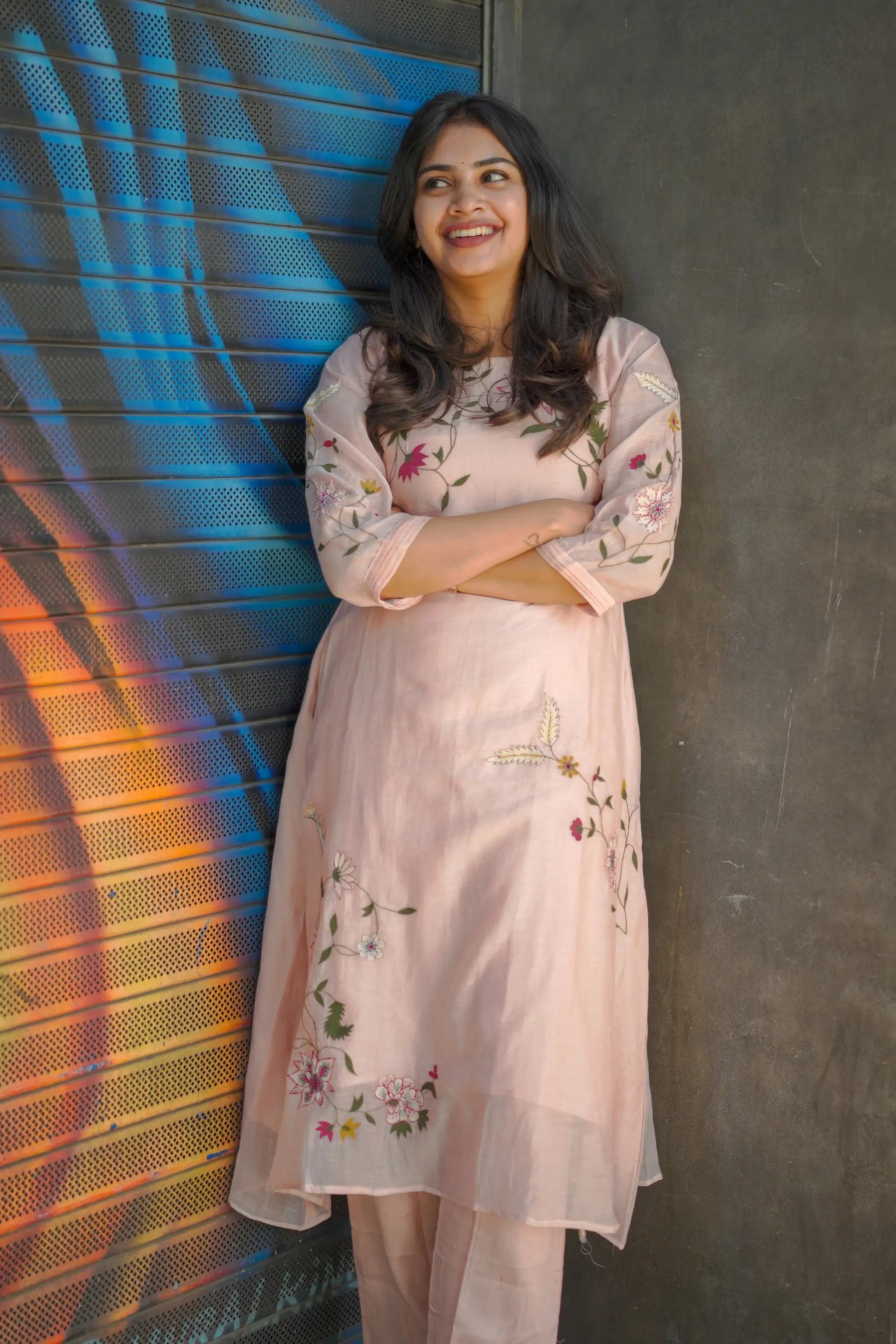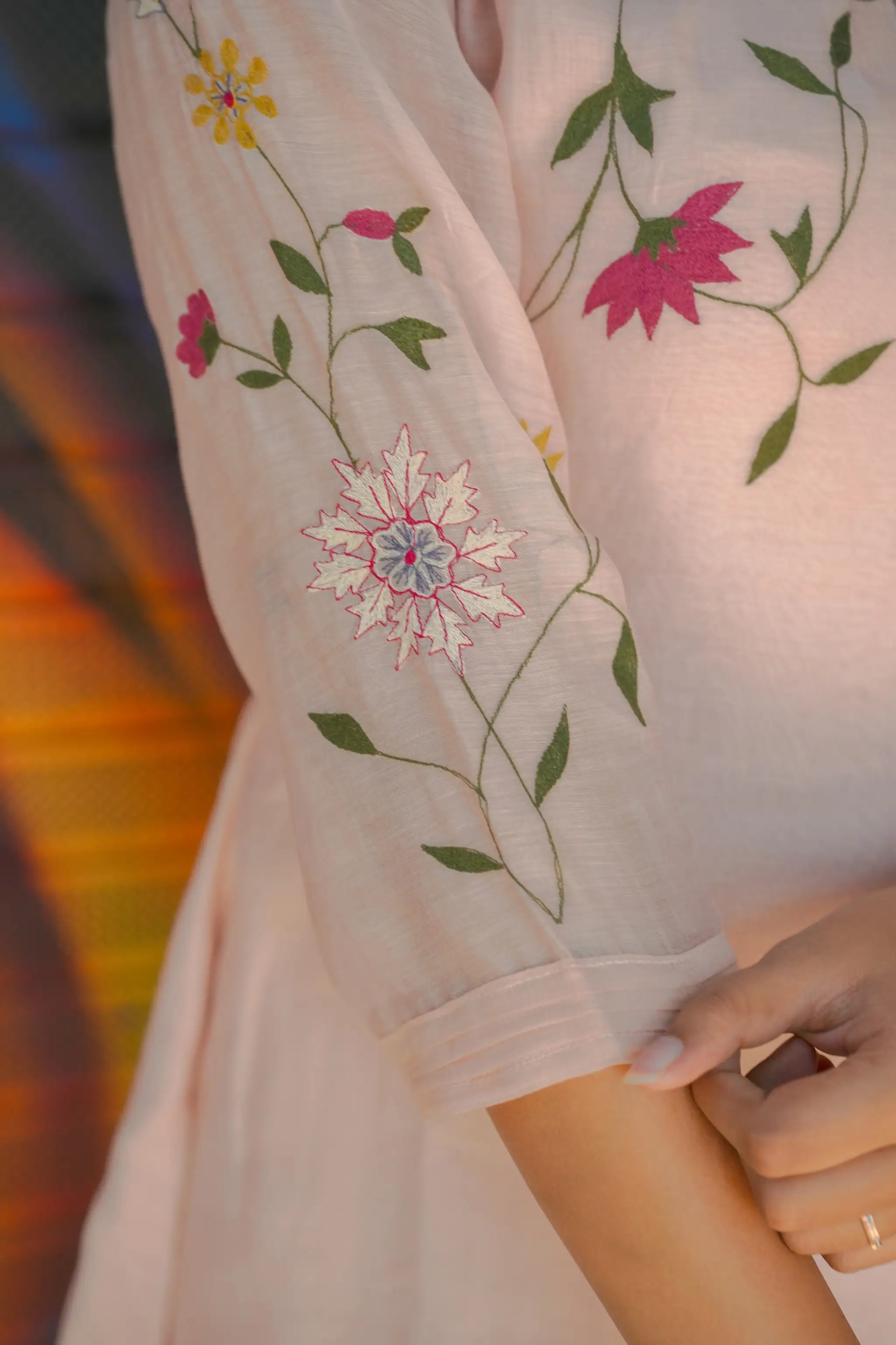 - Kurti: Crafted from soft Mul Chanderi fabric, featuring delicate floral thread embroidery across the front and sleeves.