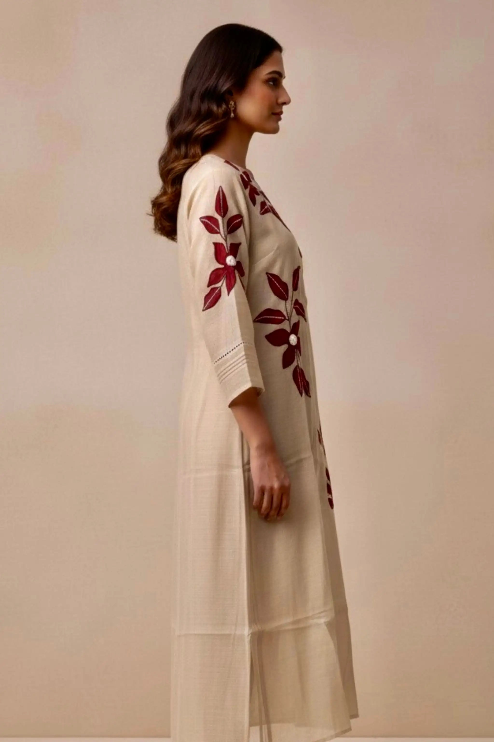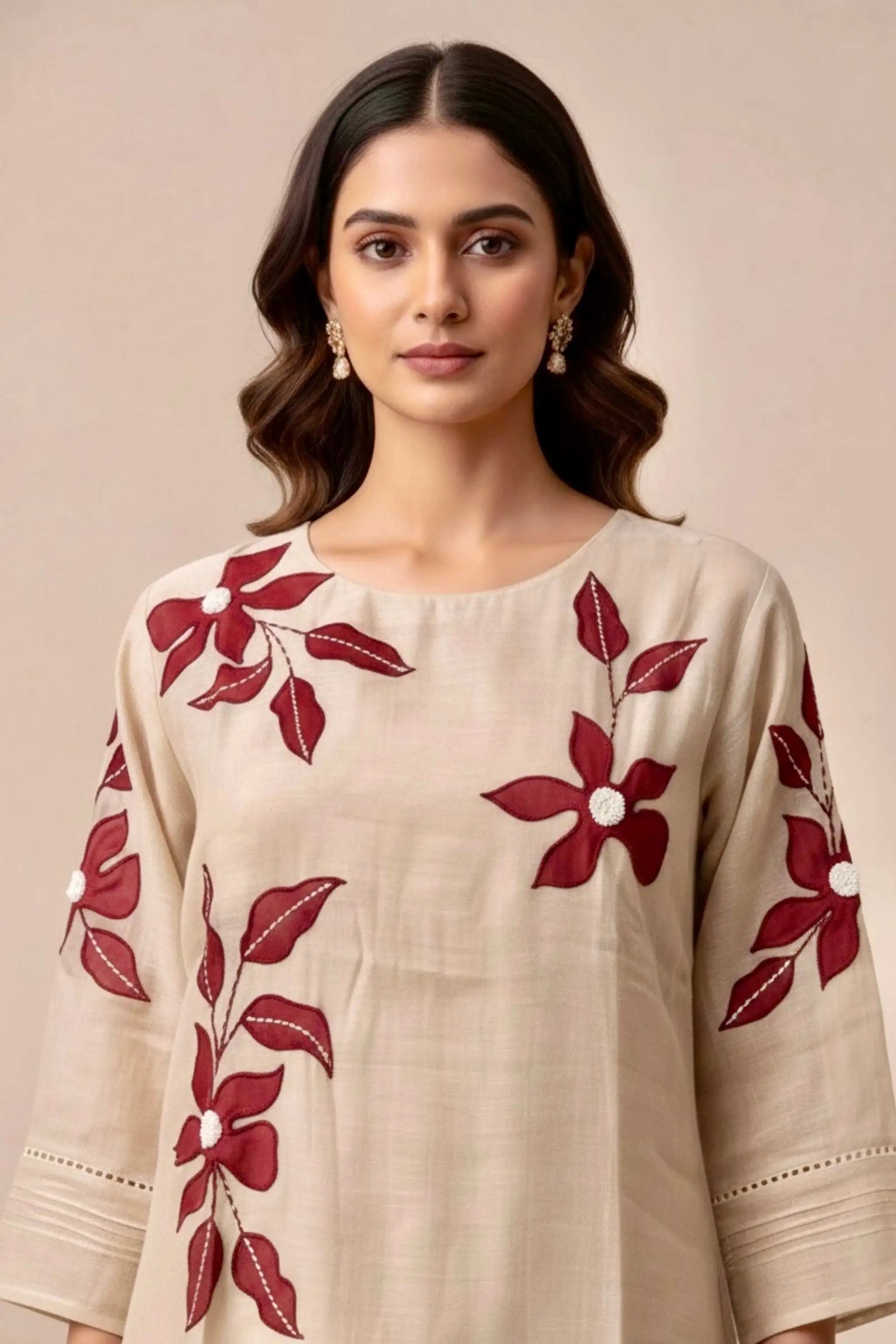 This Beige Mul Chanderi Applique Embroidered Dress brings together soft texture and understated detailing. Crafted in lightweight Mul Chanderi, the A-line silhouette falls gracefully and feels comfortable throughout the day. Delicate floral appliqué embroidery is scattered across the dress, adding depth while keeping the look subtle.