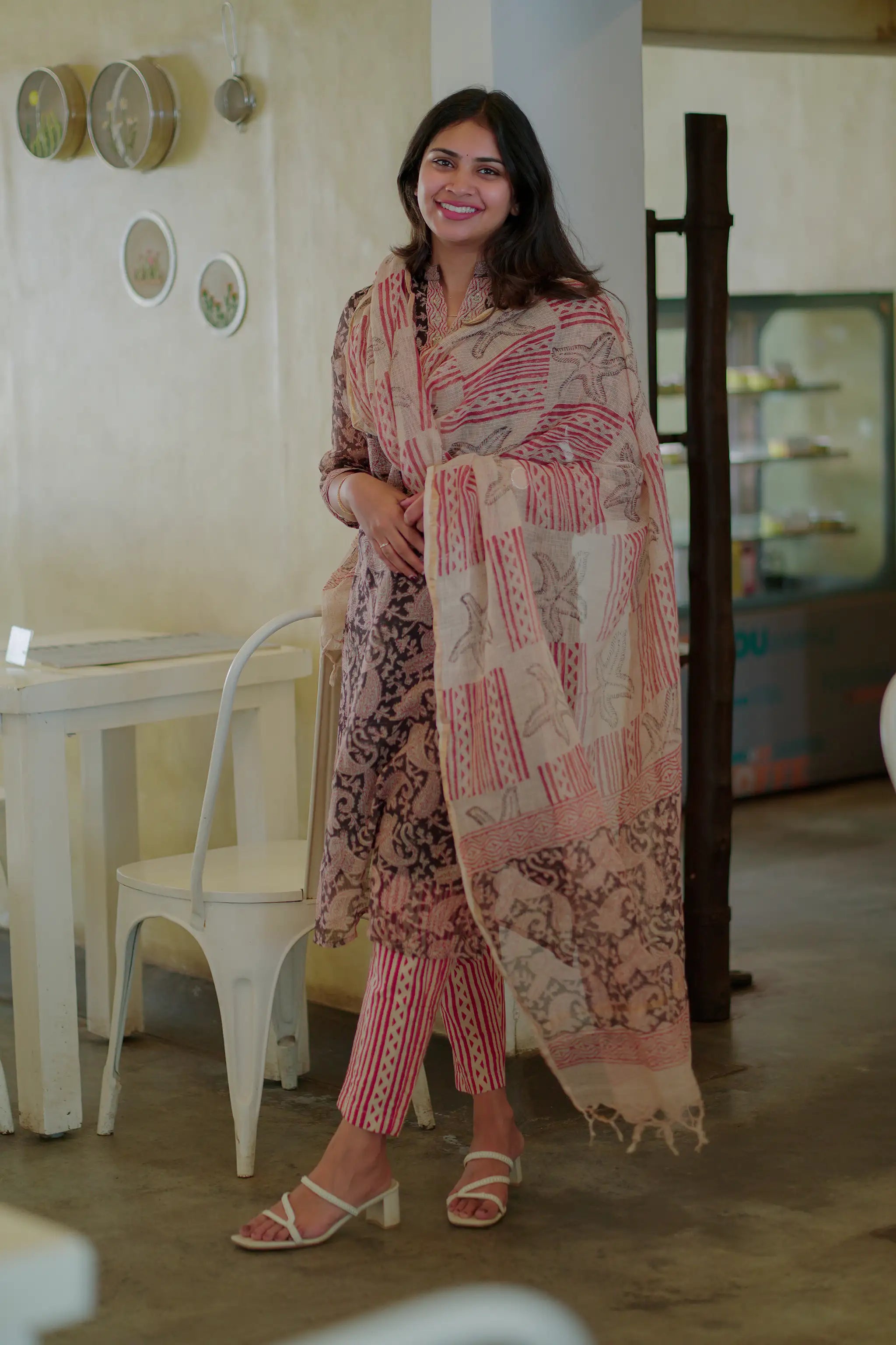 It is paired with a matching hand block-printed Kota dupatta and comfortable cotton straight-cut pants, creating an elegant and cohesive look. Lightweight and breathable, this ensemble is perfect for festive gatherings, daytime celebrations, or refined casual wear.