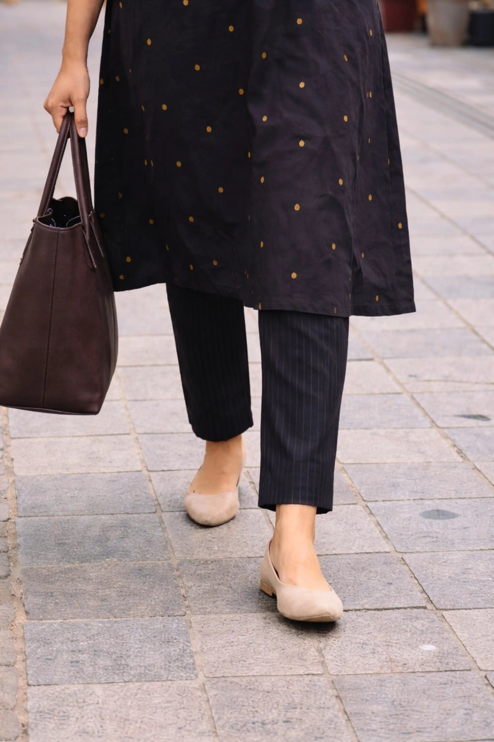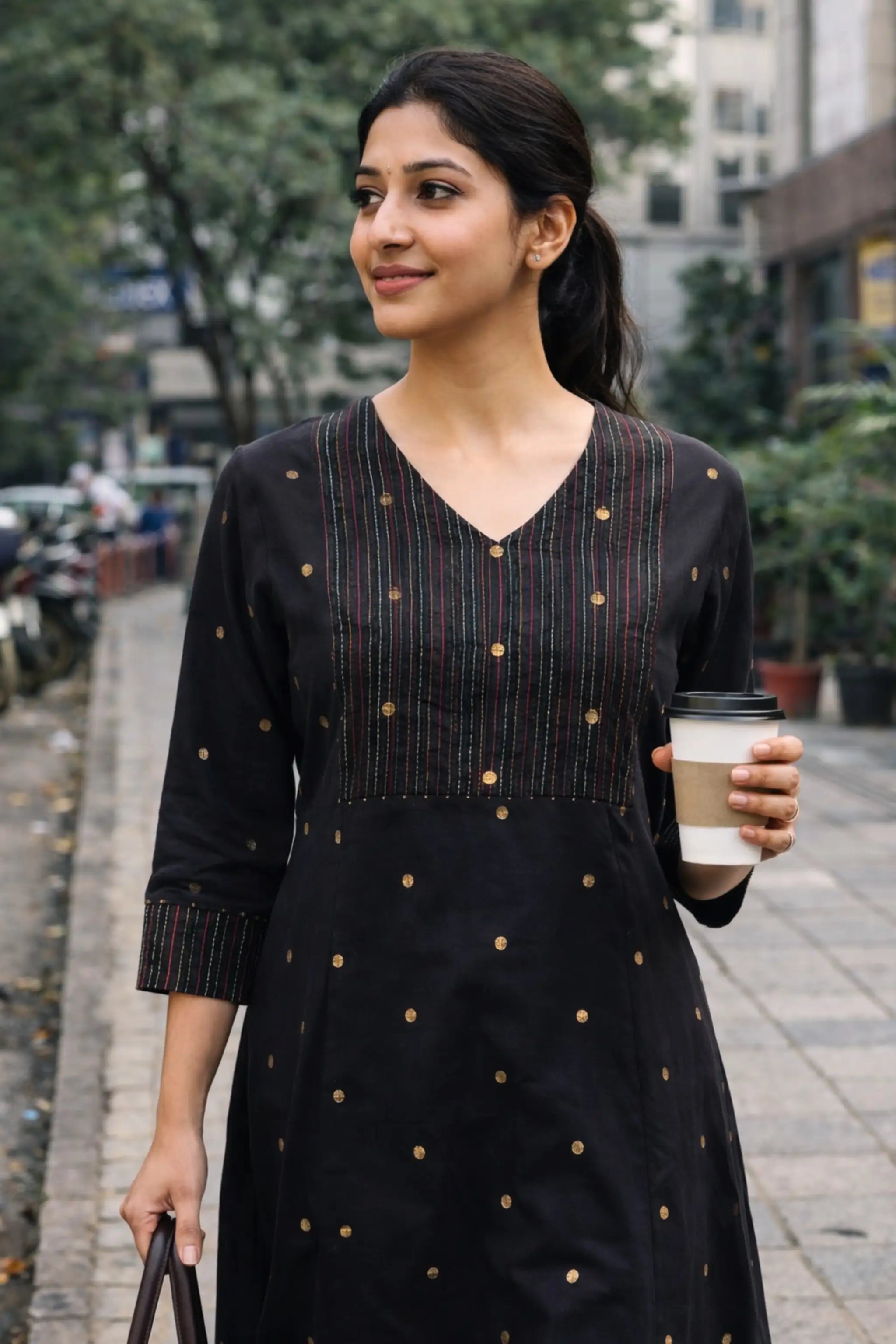 This Black Cotton Embroidered Kurti Set is designed for everyday comfort with a clean, well-finished look. The A-line kurti features a flattering V-neck and is crafted from breathable cotton, making it suitable for long hours of wear. Minimal embroidery on the yoke adds a soft highlight, while classic polka dot patterns run across the body for a timeless feel.