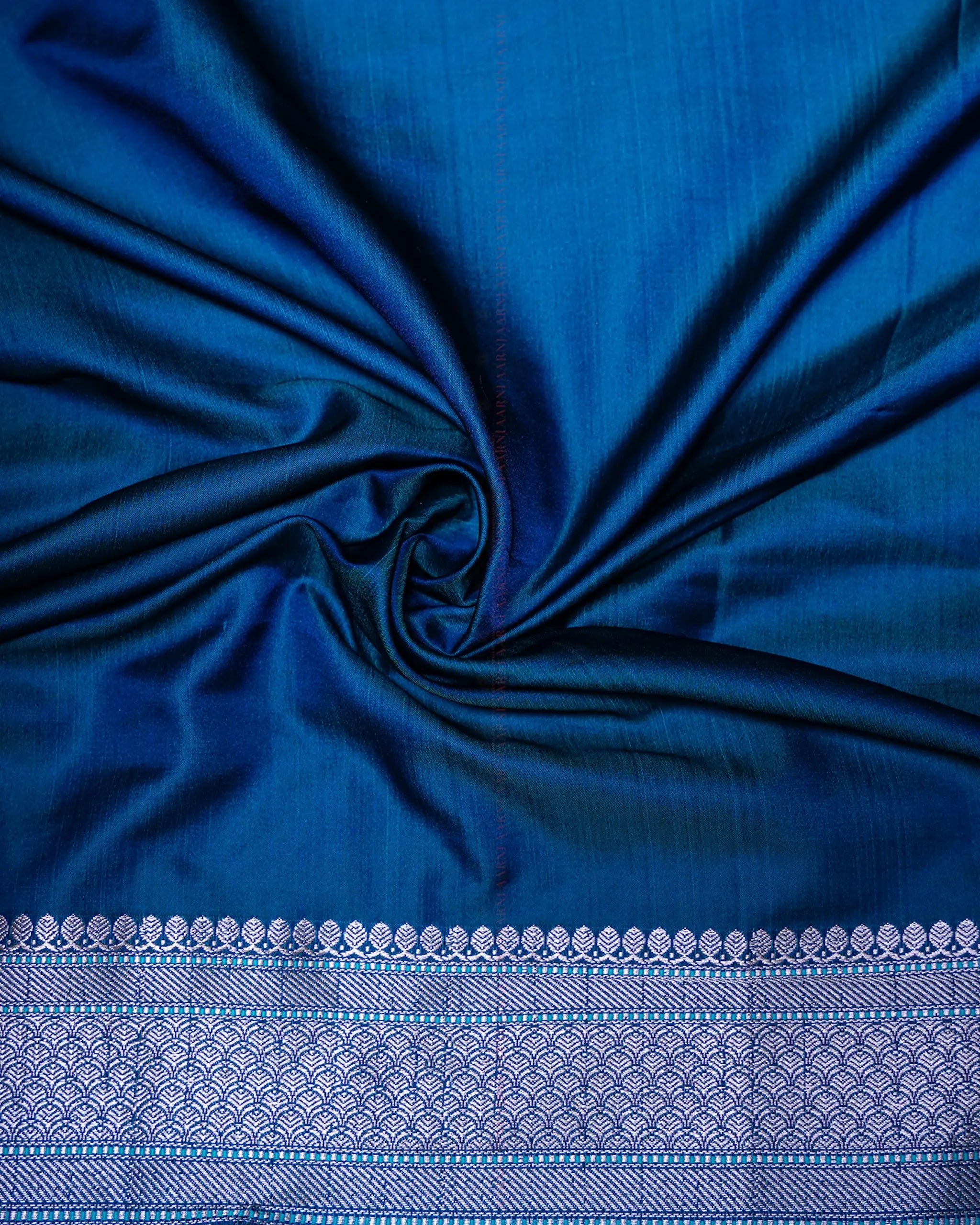 Grace meets craftsmanship in this Blue Mashru Silk Saree, woven with fine silver buttis that glimmer softly across the body. The saree features a silver zari border and a rich pallu adorned with traditional mango motifs, creating a refined and timeless look.