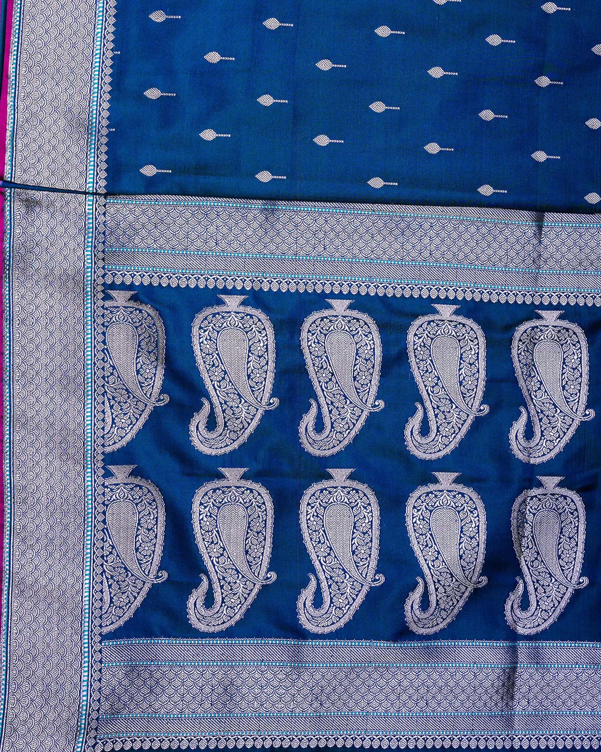 Blue Mashru Silk Saree with Silver Buttis and Contrast Piping