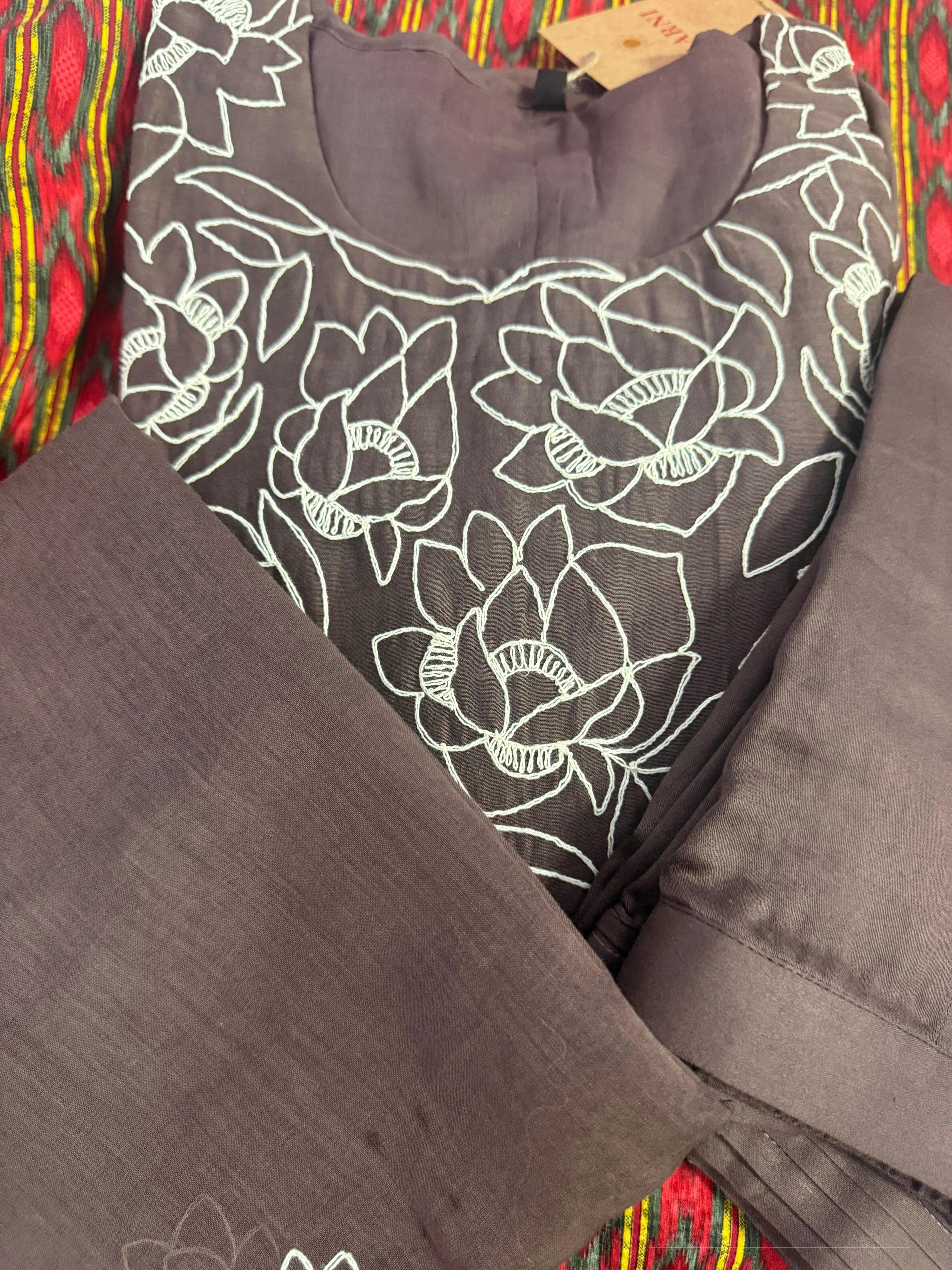Step into elegance with this Brown Mul Chanderi Suit Set, crafted from lightweight and breathable Mul Chanderi fabric. The A-line kurta features a graceful flare with intricate floral hand embroidery on the yoke and sleeves, offering a blend of tradition and sophistication.