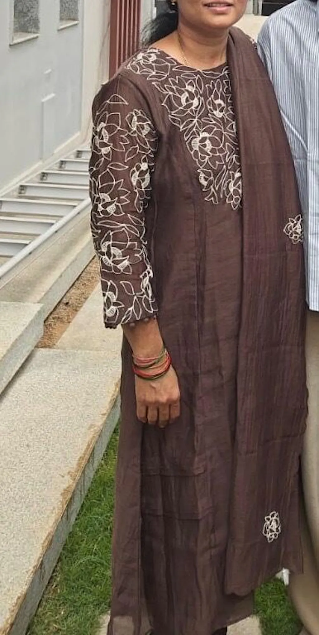 - Kurta: Brown Mul Chanderi with delicate floral hand embroidery.