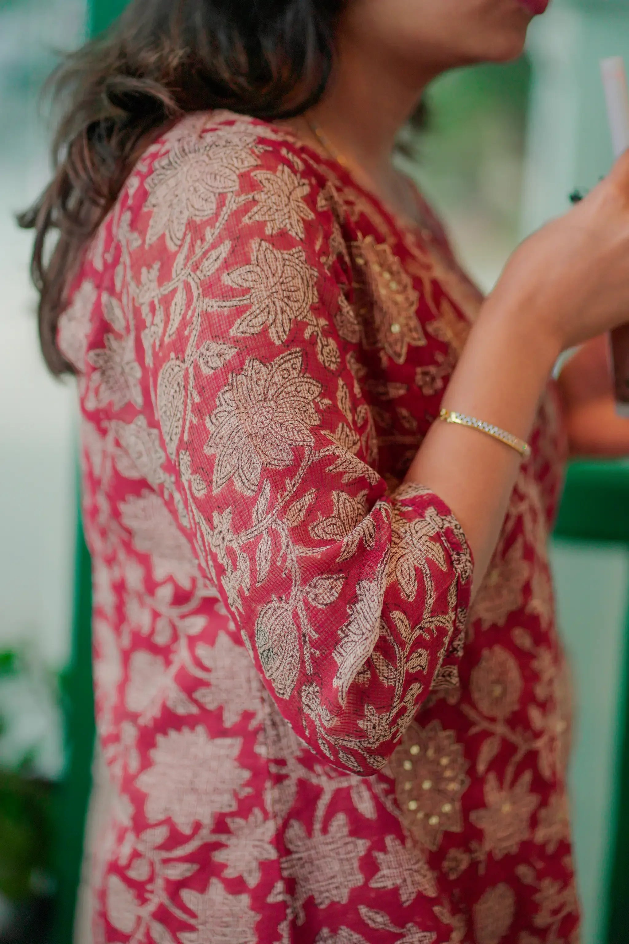 - Hand block-printed Kota kurti with sequins embroidery.