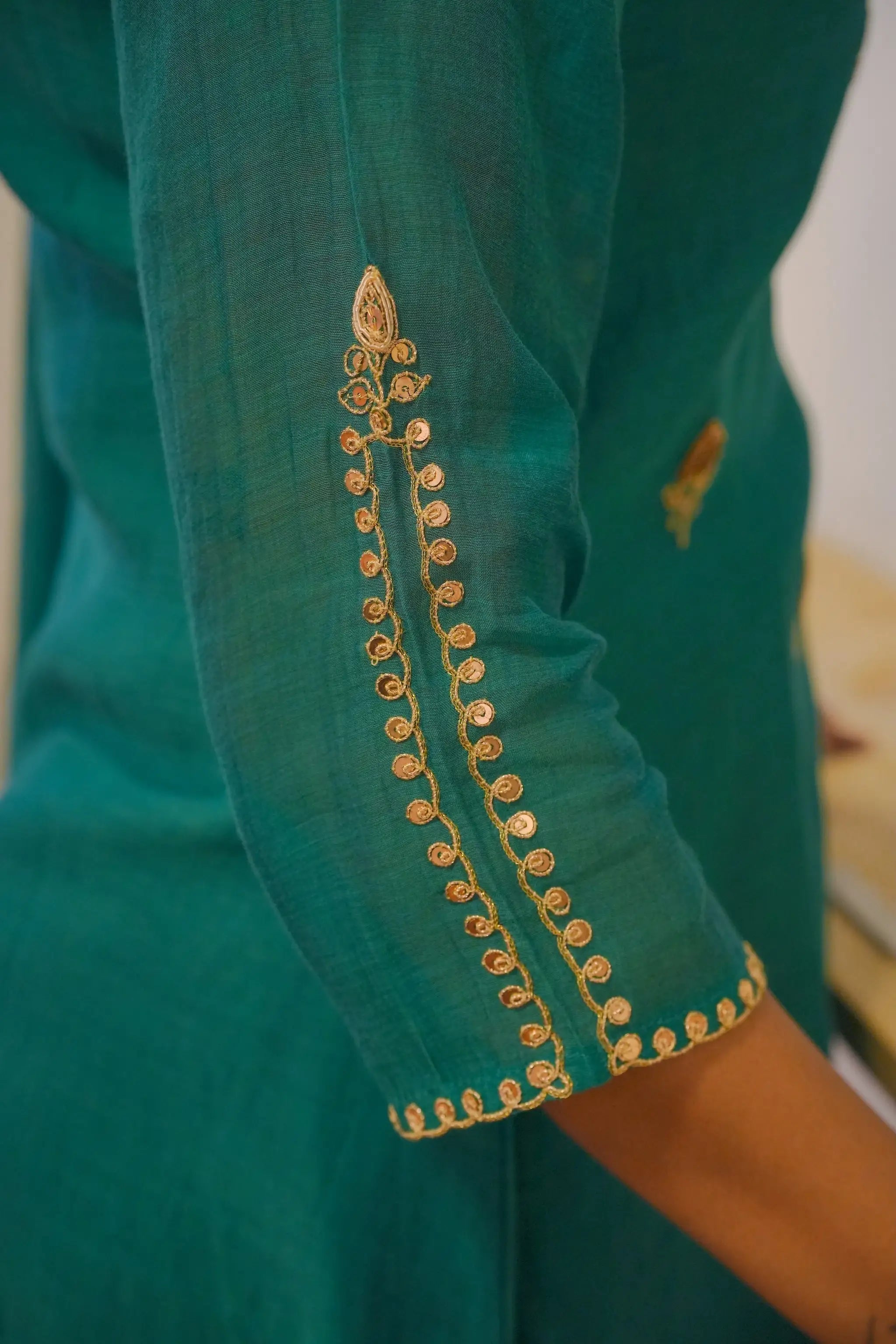 Green Mul Chanderi Sequins & Zari Embroidered Suit Set with Hand-Painted Dupatta