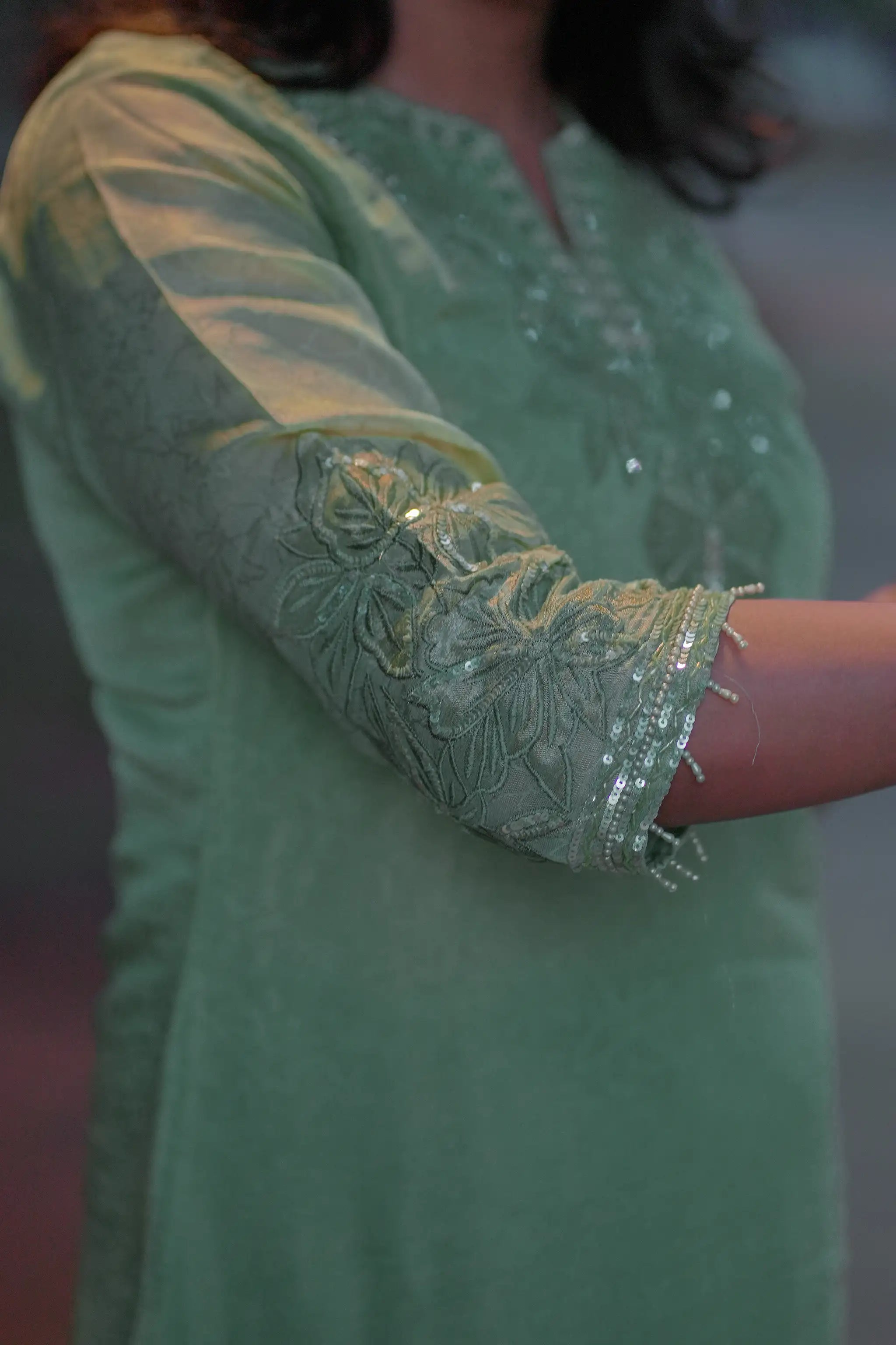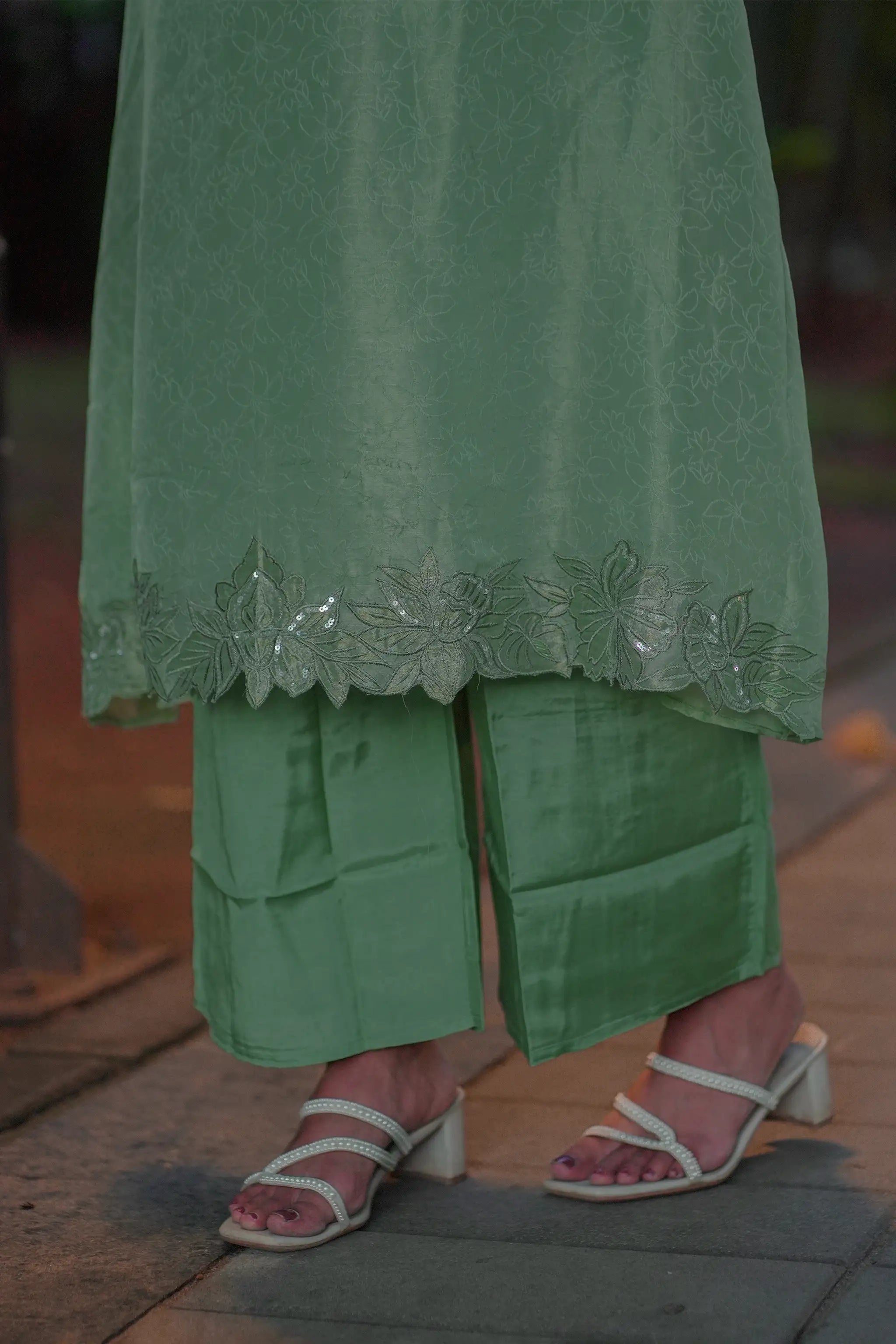 The Green Tissue Silk Applique Embroidered Suit Set blends rich craftsmanship with understated grace. The tissue silk kurti features a floral appliqué neckline adorned with hanging beads, sequins, and mirror embroidery, giving it a festive shimmer that catches the light beautifully.