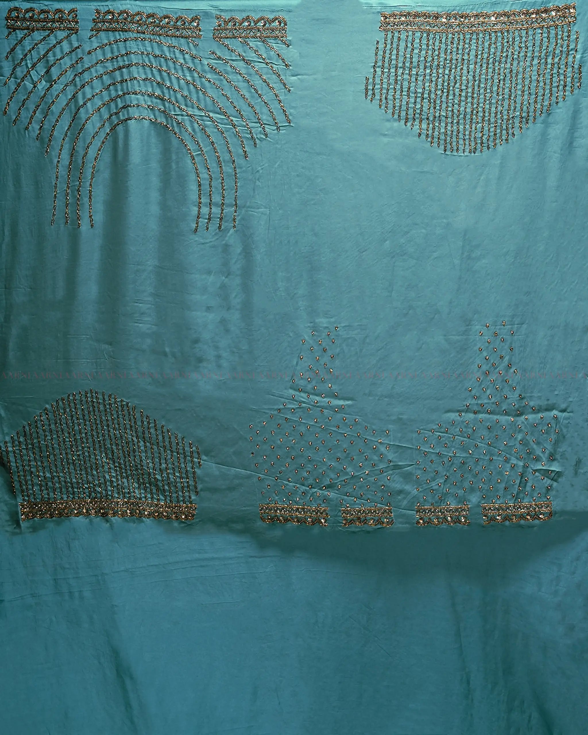 Designed in a half-and-half style, it combines a Turkish organza pallu with pure crepe fabric pleats, creating a graceful drape with a rich texture contrast. The saree is paired with a beautifully embroidered blouse, embellished with delicate beadwork on the front neck, back neck, and sleeves for a sophisticated finish.