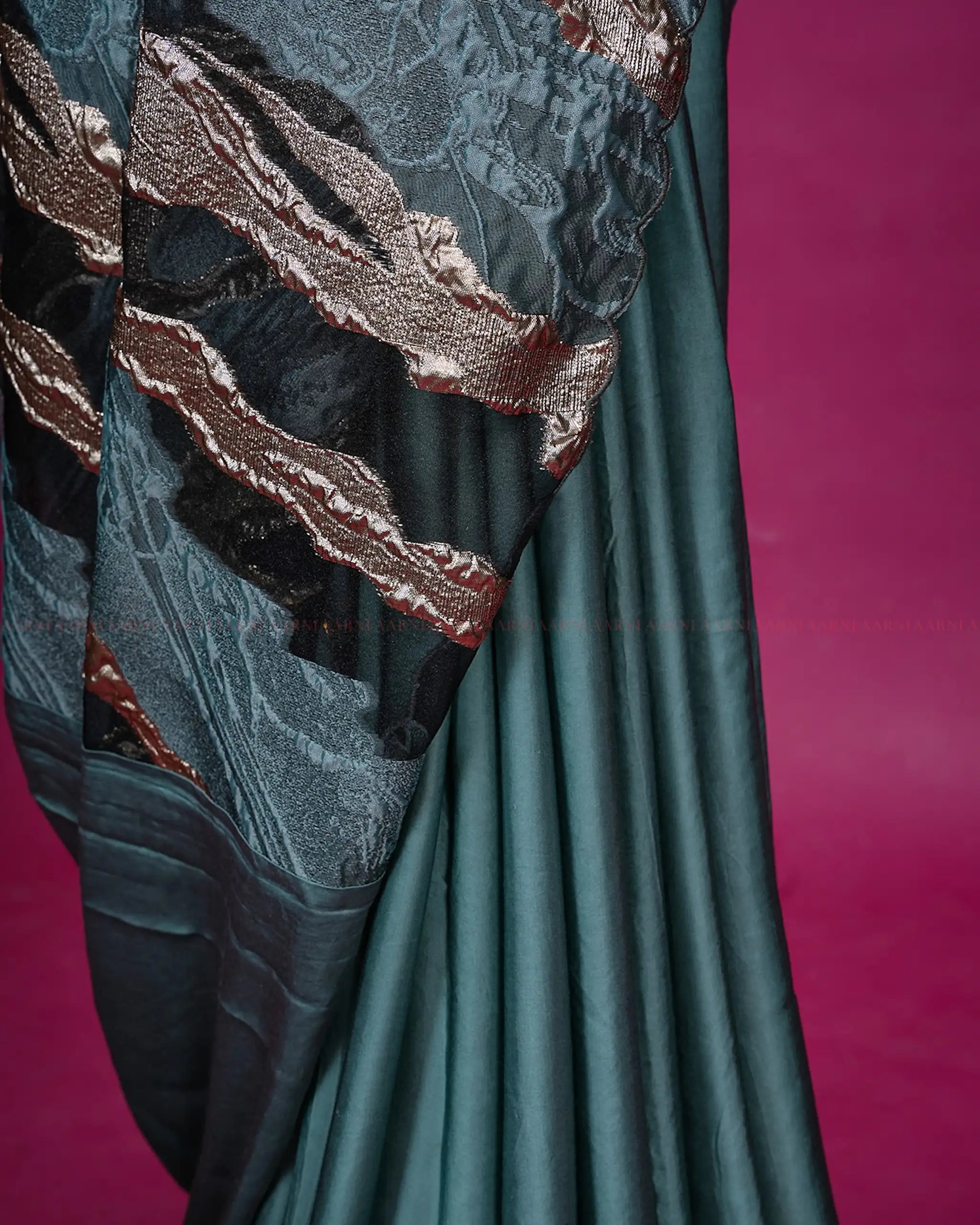 Green Turkish Organza Saree with Embroidered Blouse and Crepe Pleats