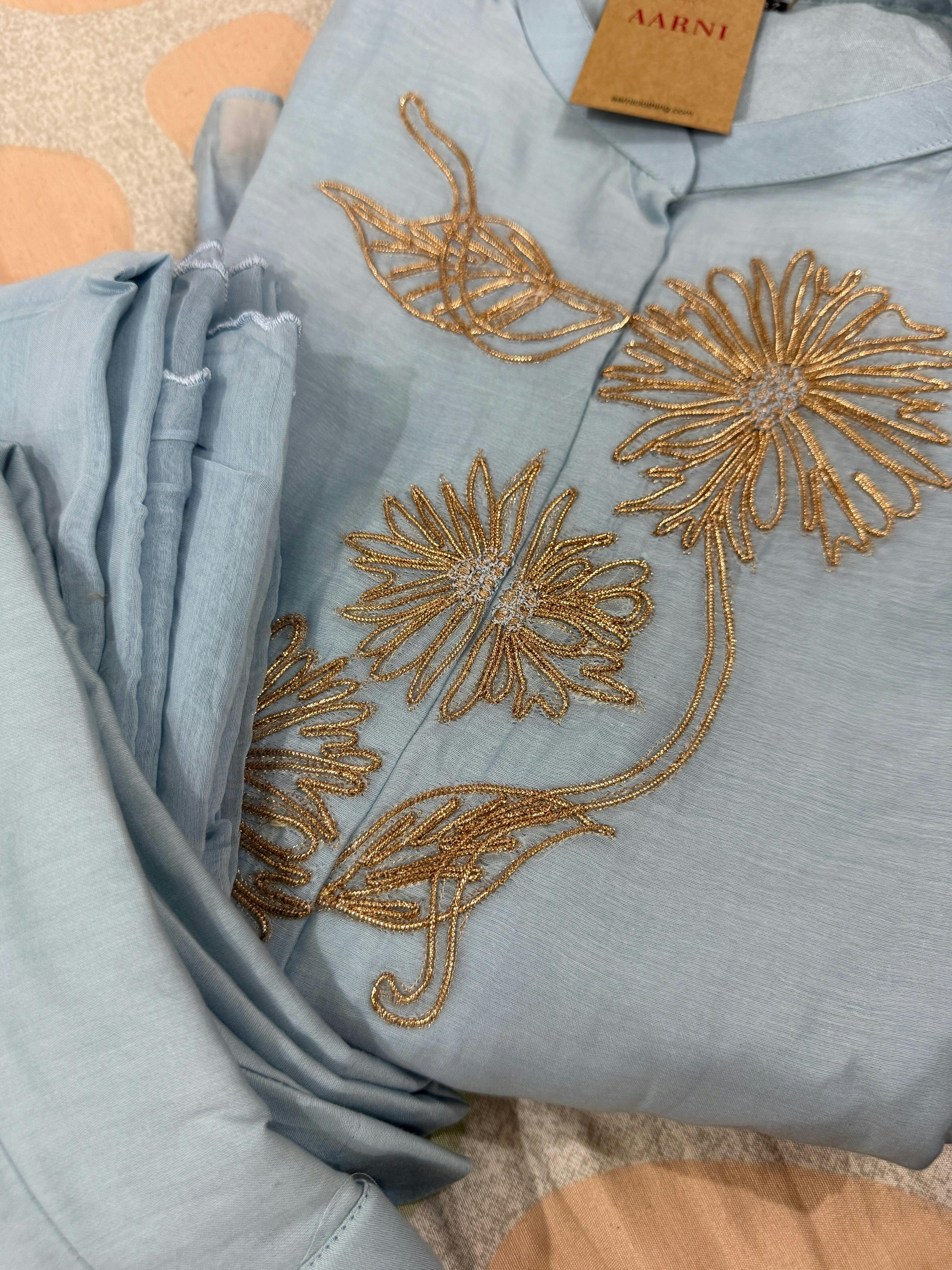This Light Blue Mul Chanderi Silk Floral Embroidery Suit Set brings a calm, refined charm to your wardrobe. The A-line kurti comes in a soft sky-blue tone and features a Chinese collar with delicate floral embroidery along the yoke. The gentle bell sleeves add a nice flow that blends classic and contemporary styling.