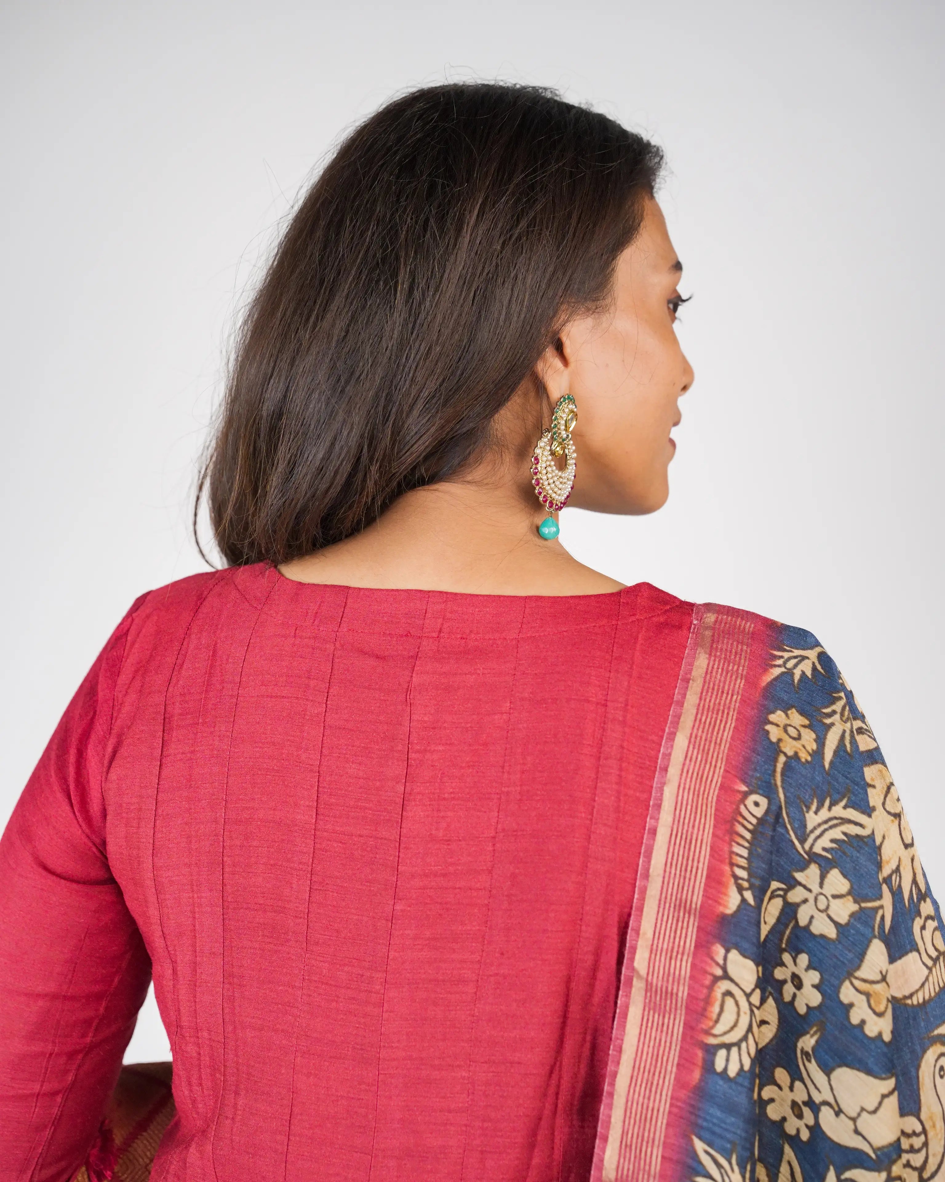 Set Includes: Red Munga Tussar anarkali kurta with Banarasi patchwork and bead embroidery, straight-cut Banarasi pants, and Kalamkari printed dupatta.