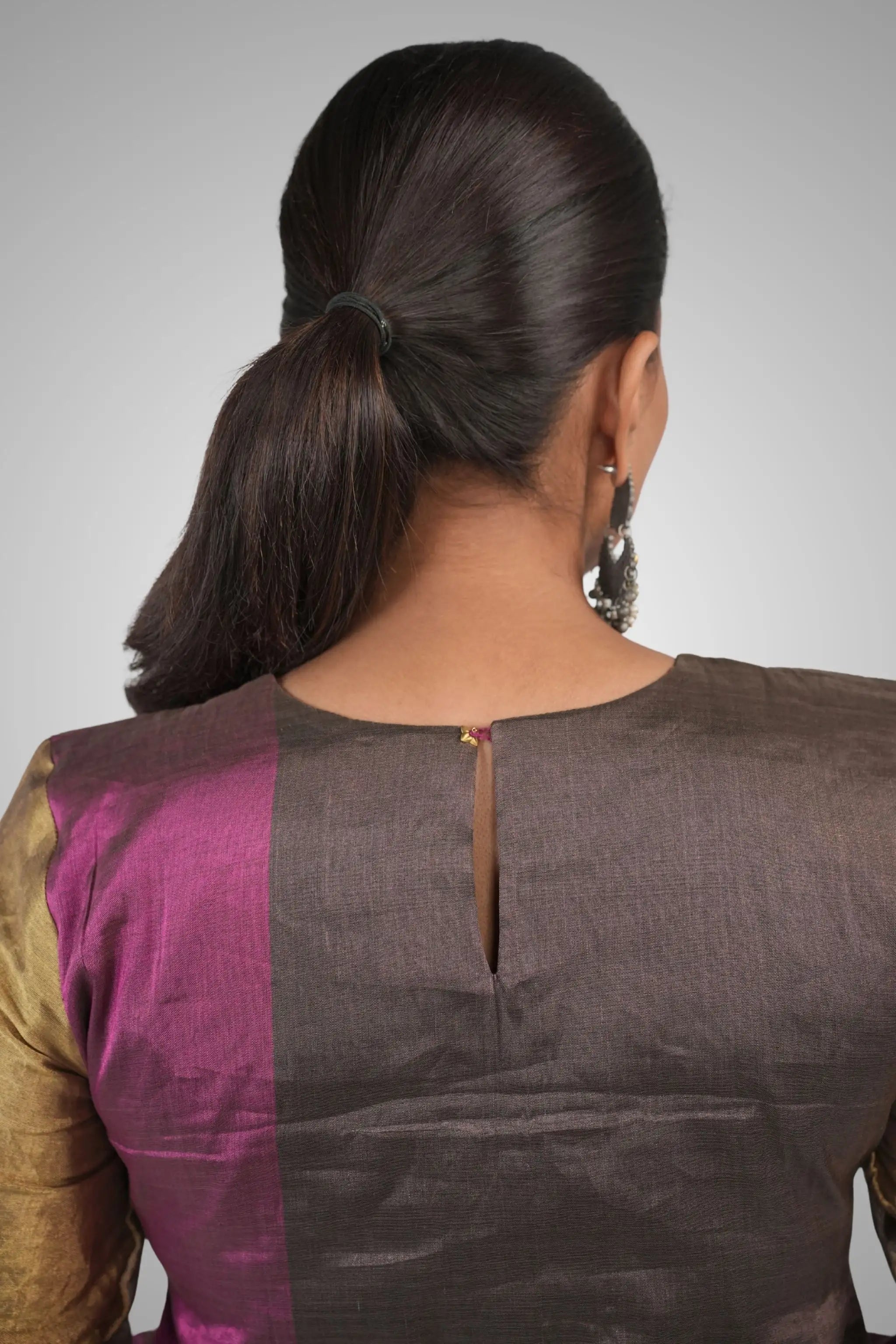 The interplay of gold, brown, and pink is not random. Each colour panel is thoughtfully placed to create a slimming, structured visual effect while highlighting the natural lustre of the tissue silk from different angles. As the fabric catches light, each panel shimmers differently, giving the kurti a dynamic, multi-dimensional quality that photographs cannot fully capture.