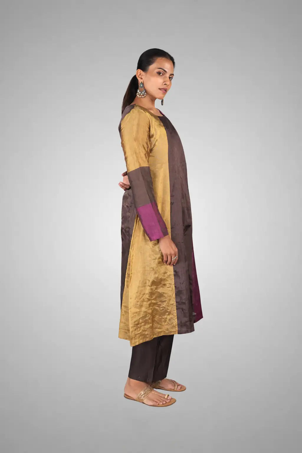 The A-line kurti is crafted in Banarasi tissue silk, a fabric that carries a natural luminosity and soft, textured sheen that ordinary silk simply cannot match. What makes this piece truly distinctive is the striking colour blocking across the body. Rich pink forms the central panel, flanked by deep brown along the sides, while golden Banarasi panels run along the sleeves, creating a tonal composition that feels intentional, artistic, and fashion-forward.