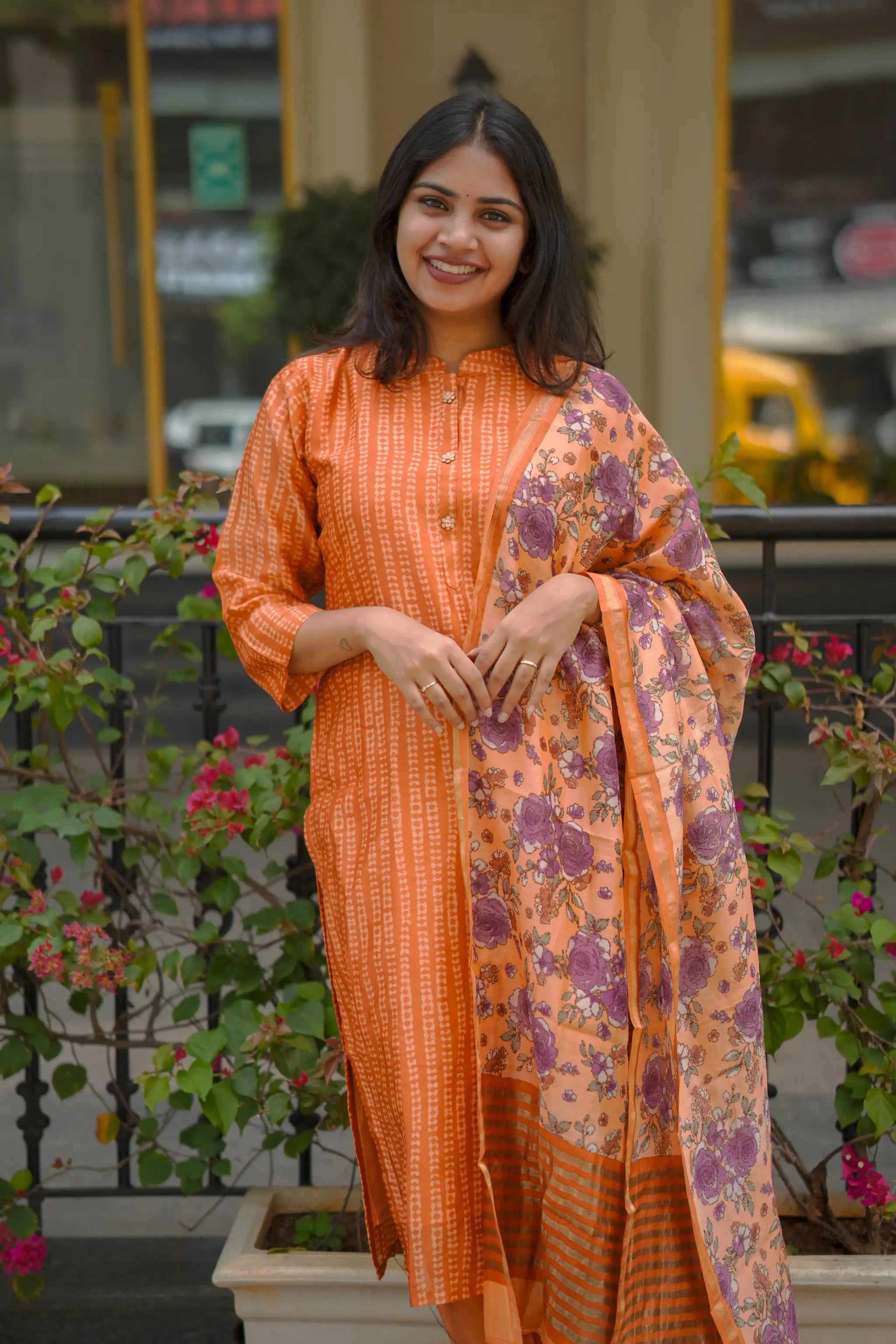 Orange Chanderi Straight Cut Suit Set with Floral Digital Print Dupatta