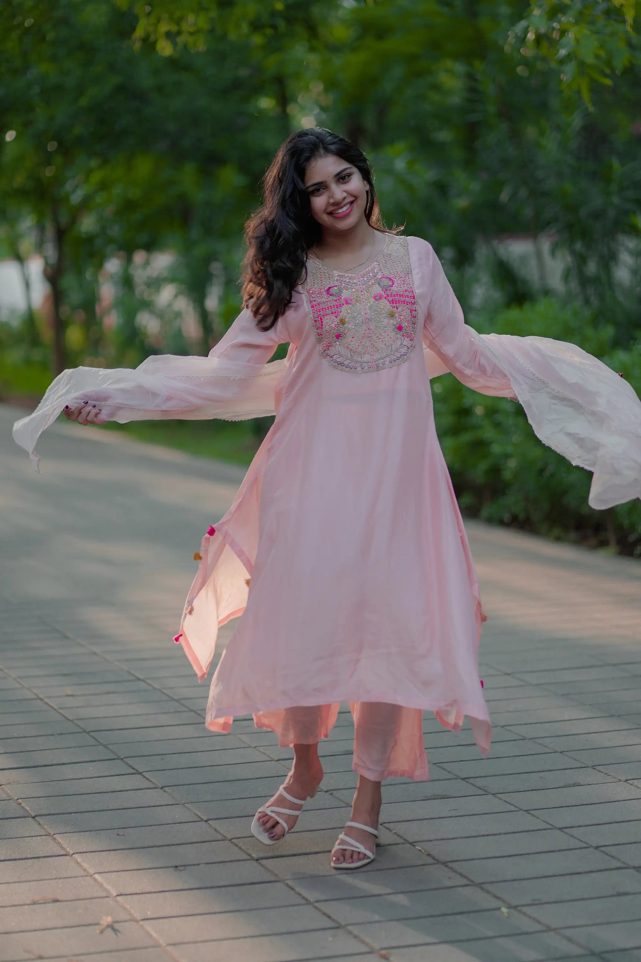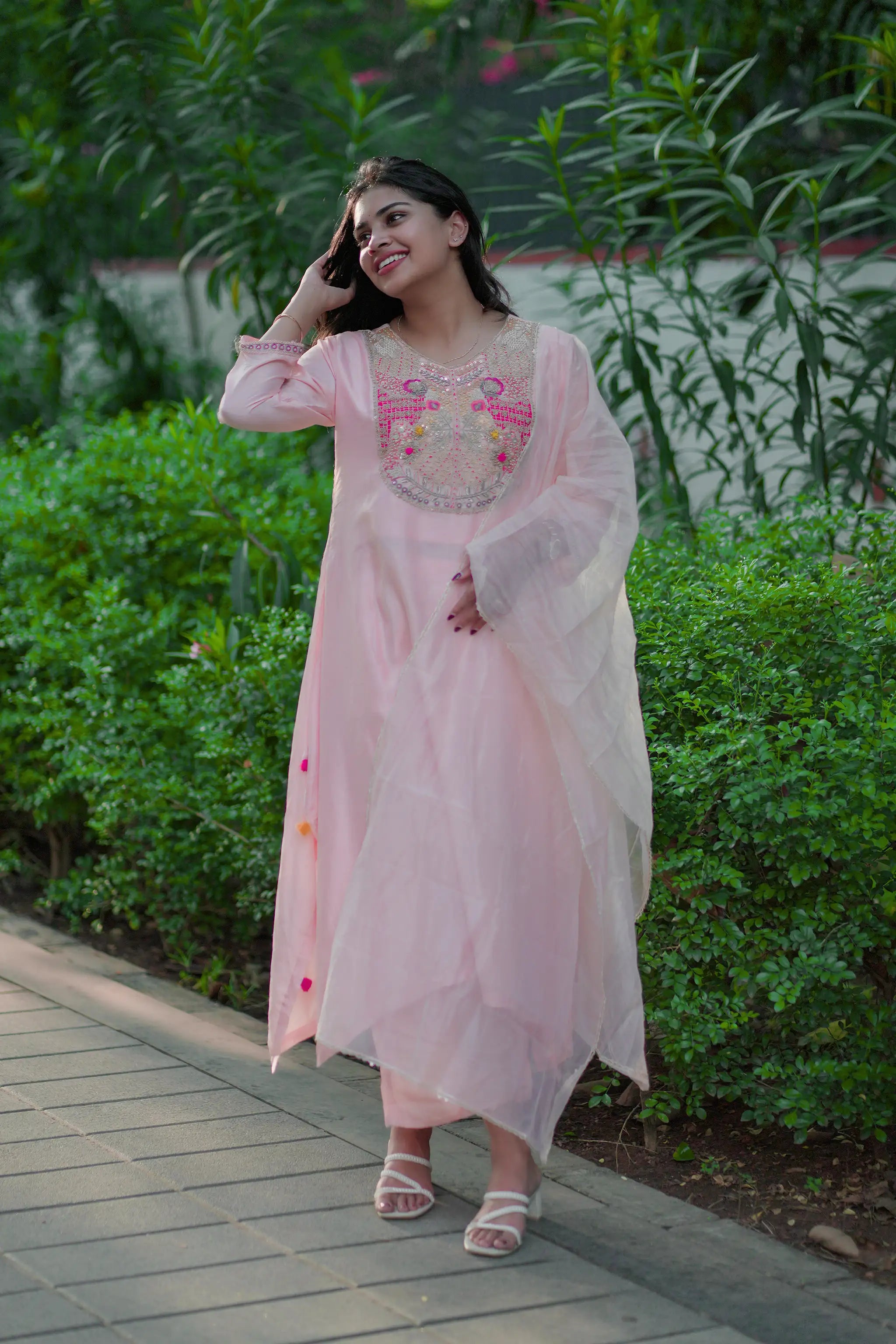 The Pink Dola Silk Zardosi Embroidered Suit Set blends elegance with intricate craftsmanship. The A-line Dola silk kurti in soft baby pink features a floral embroidered neckline enriched with zardozi, sequins, and beadwork, giving it a refined festive charm.