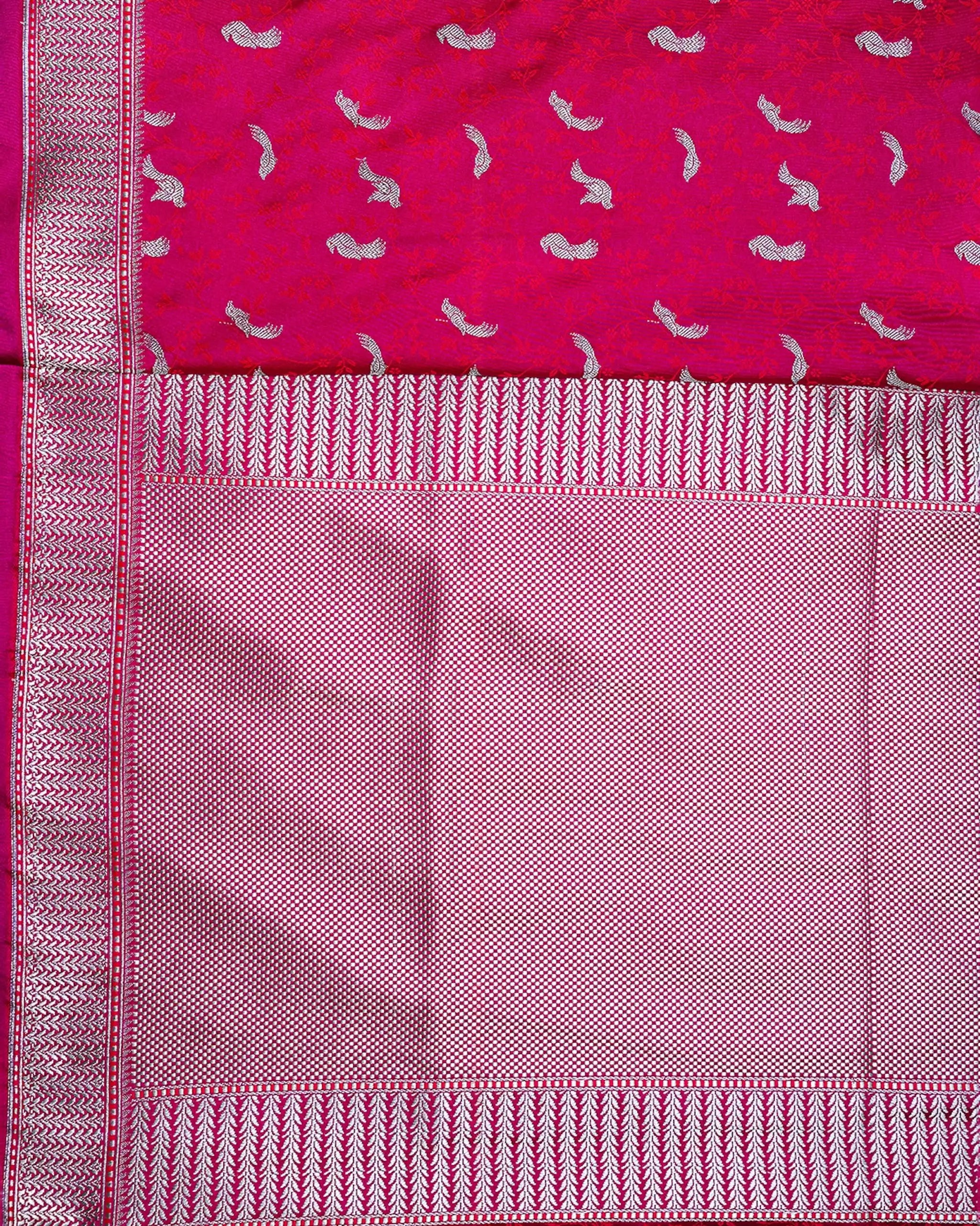 - Detailed silver zari motifs across the body and pallu.