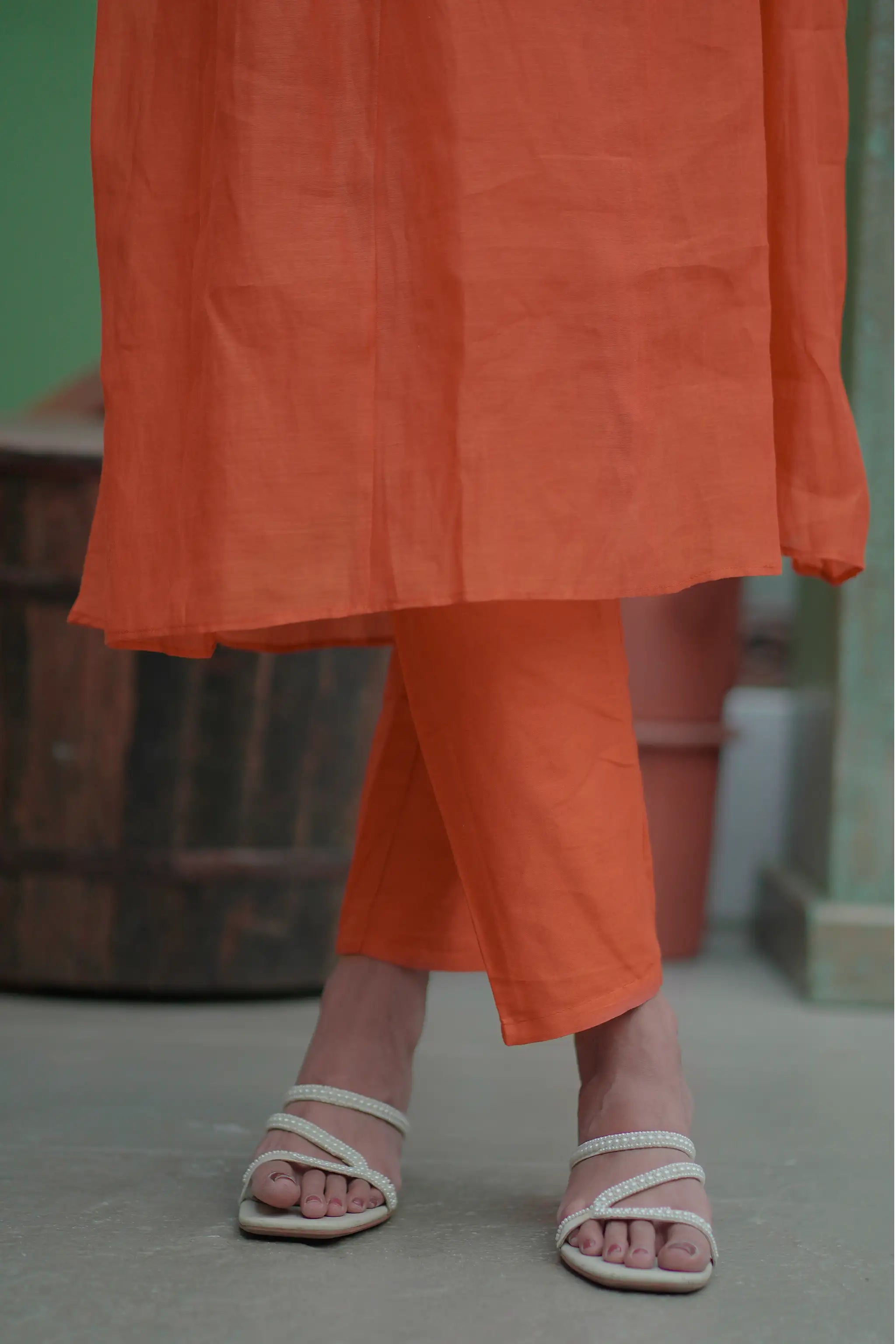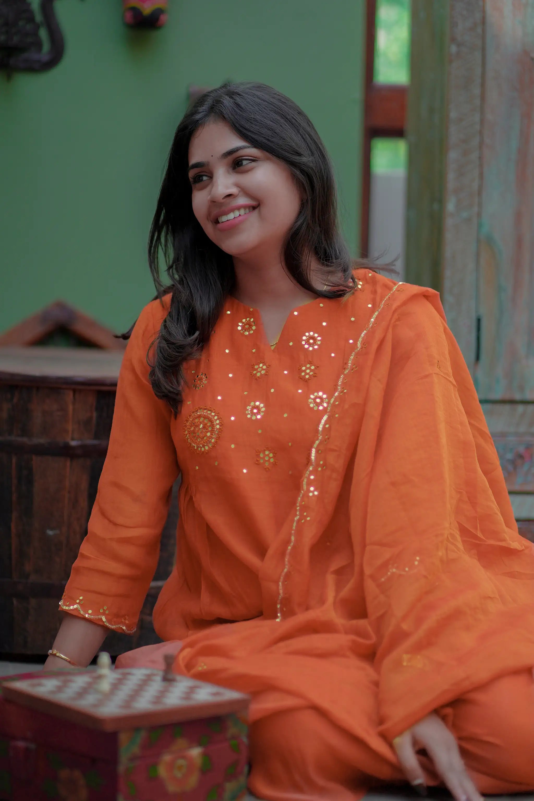 Rust Orange Mirror Embroidered Mul Chanderi Suit Set