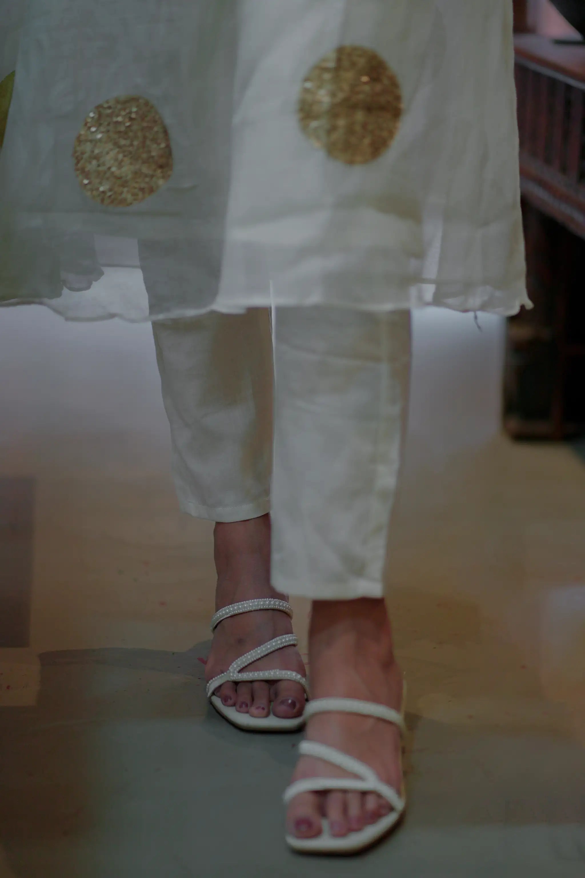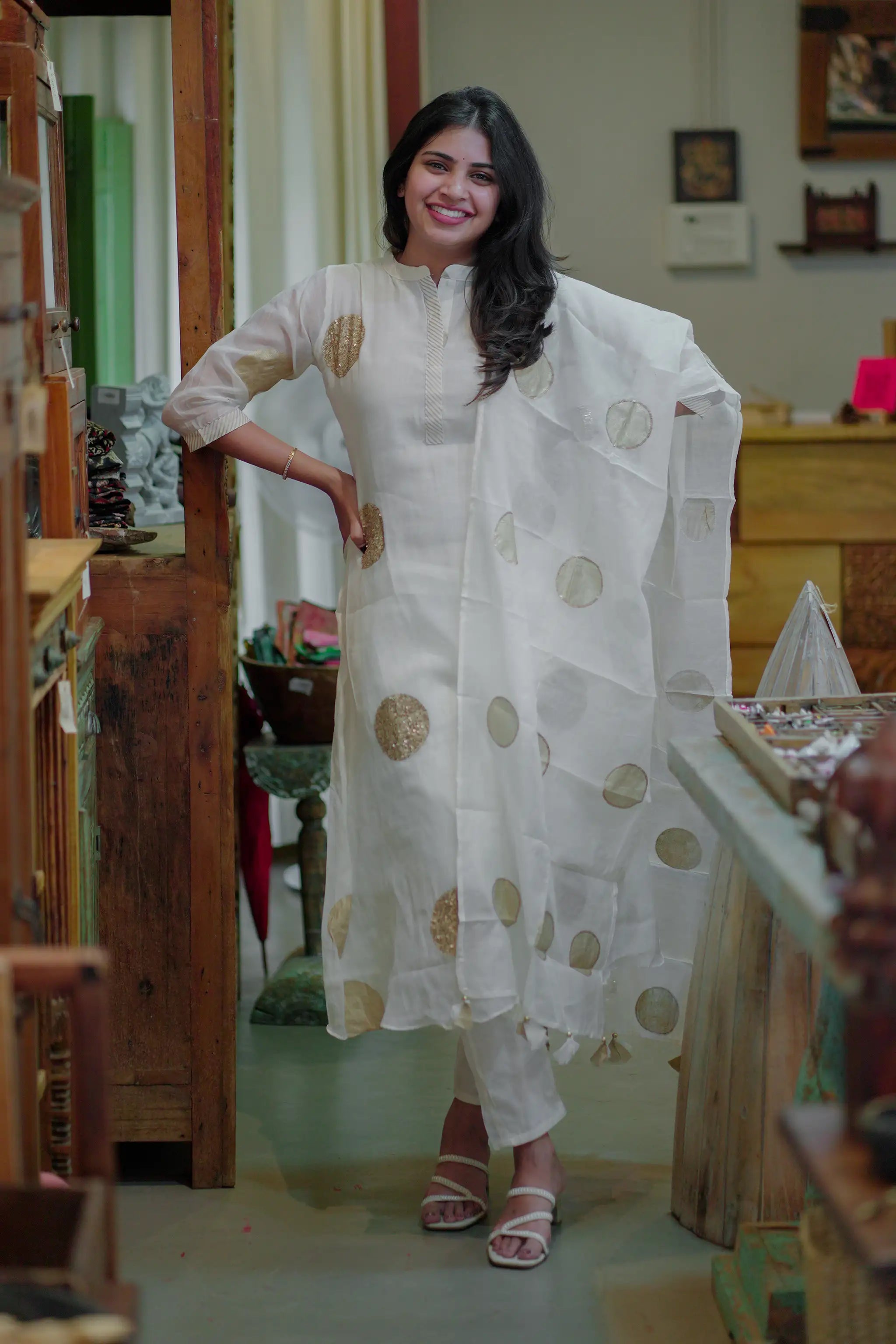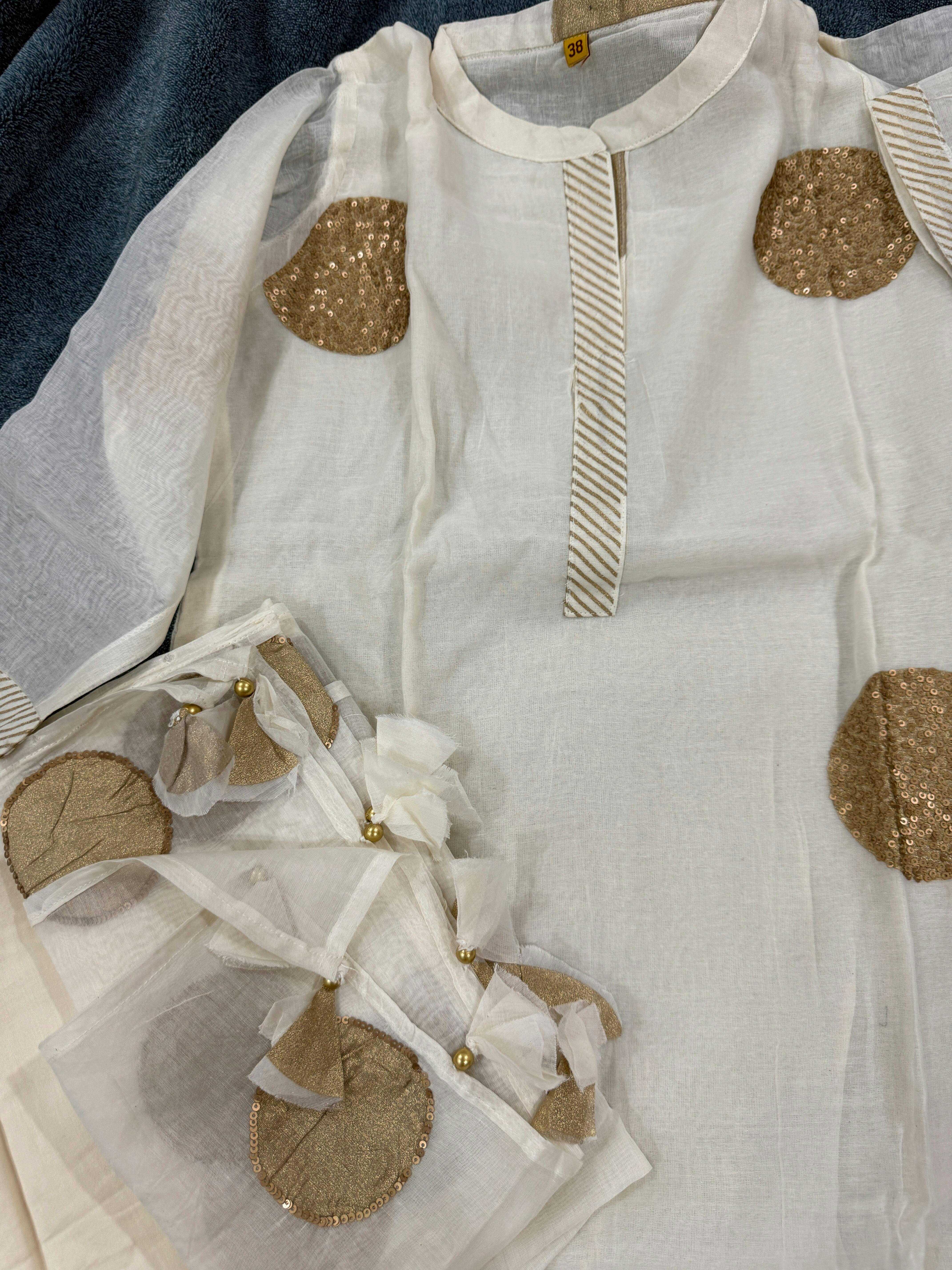 It comes paired with straight-cut pants and a matching Mul Chanderi dupatta showcasing the same gold circle detailing, creating a refined, coordinated ensemble. Perfect for festive gatherings, daytime events, or elegant evening wear, this outfit blends traditional charm with effortless sophistication.