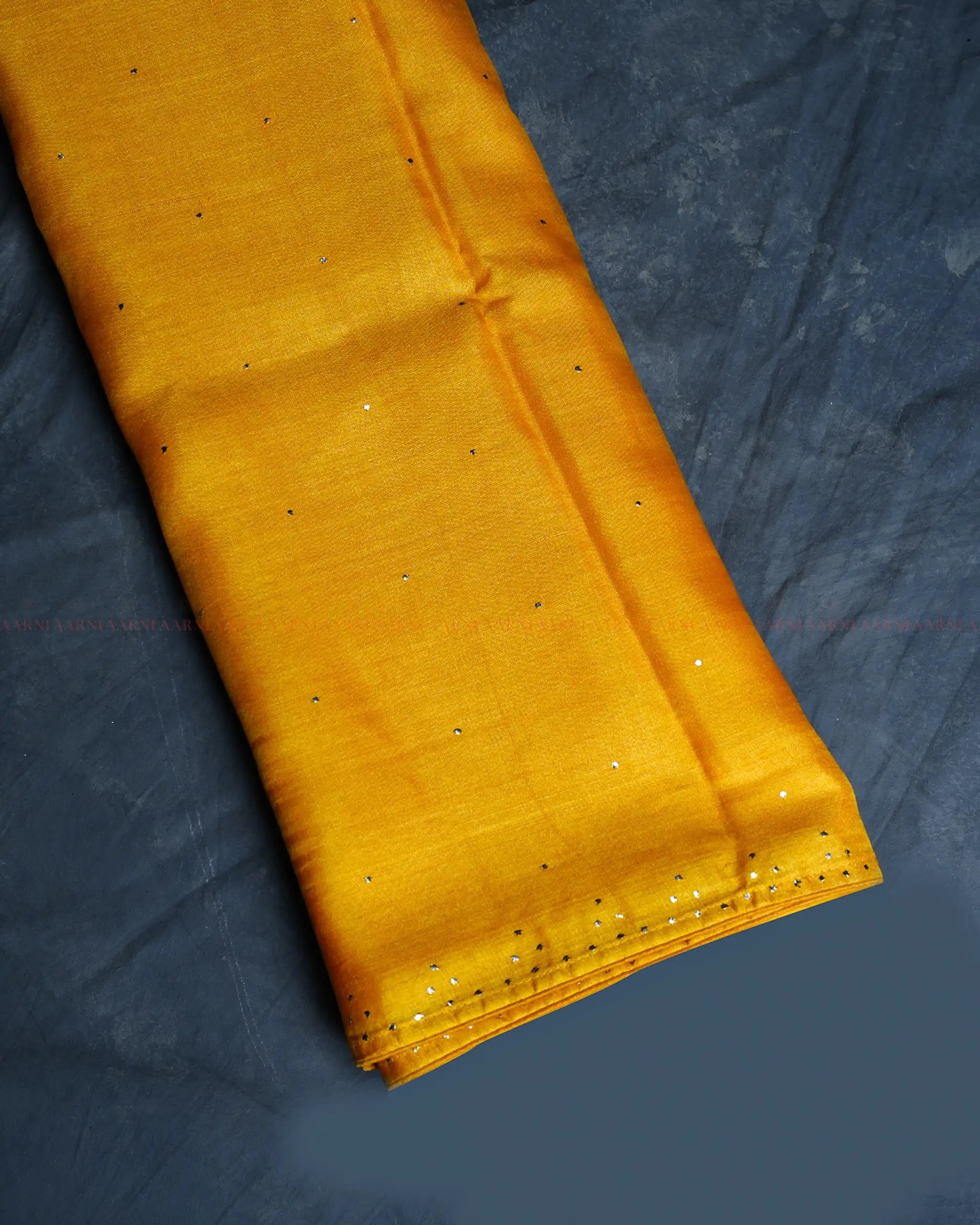 This Yellow Tussar Silk Saree brings a perfect blend of brightness and elegance. The saree is beautifully adorned with delicate Mukesh work chips scattered across the body, creating a soft shimmer that enhances its natural Tussar texture.